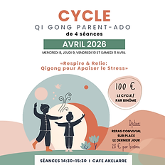 Cycle de 4 séances, le mercredi 8, jeudi 9, vendredi 10 et samedi 11 avril, de 14h30 à 15h30. En binôme parent & adolescent (de 11 à 16 ans). Attention, les places seront limités à 4 binômes maximum! UNE INSCRIPTION (PLACE) VAUT POUR UN BINÔME Une bulle hors temps pour apprendre ensemble, parent et enfant, à souffler, à se détendre, à ralentir, à fluer avec le mouvement, à se relier avec son corps, ses perceptions et son entourage. Les différents techniques explorées nous apporterons des outils pour apaiser nos état de stress —abaisser fréquences cérébrale et cardiaque, régulariser respiration, calmer agitation mental et émotionnelle—, pour stabiliser nos systèmes nerveux et retrouver du tonus vagal. Un temps de présence pour connecter nos ressources intérieurs et faire l'expérience d'une façon «d'être au monde» qui nous apporte de la sérénité, de la bonne humeur, de l'ouverture et de l'ancrage. C’est un moment precieux pour nourrir le lien parent-enfant d’une qualité de présence et d’écoute renforcée. Au programme: ✦ Respirations & mouvements conscients avec le corps ✦ Marches & danses connectés aux élans de l’intérieur… et de son partenaire ✦ Massages et stimulations de points énergétiques ✦ Synchronicités et rythmes ✦ Des idées claires, des notions et des outils à emprunter dans son quotidien Possibilité de partager un repas convivial sur place le dernier jour de stage, juste avant la pratique: rdv samedi 11 avril à 12h30 au café Akelarre pour ceux qui le souhaitent. Un formule déjeuner spéciale binôme pour 28€ (entré+plat OU plat+dessert) vous sera proposée. À régler directement sur place. Merci de bien cocher L'OPTION REPAS lors de l'inscription au cycle pour tenir compte de la réservation.